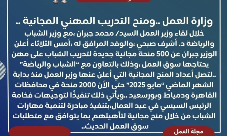 وذلك بالتعاون مع “الشباب والرياضة” لتصل أعداد المنح المجانية التي أعلن عنها وزير العمل،