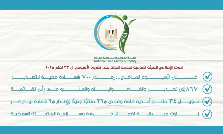 أصدر المركز الإعلامي للهيئة القومية لسلامة الغذاء تقريره الأسبوعي الـ 23 لعام 2025، وذلك عن الفترة من 28 يونيو – 3 يوليو،