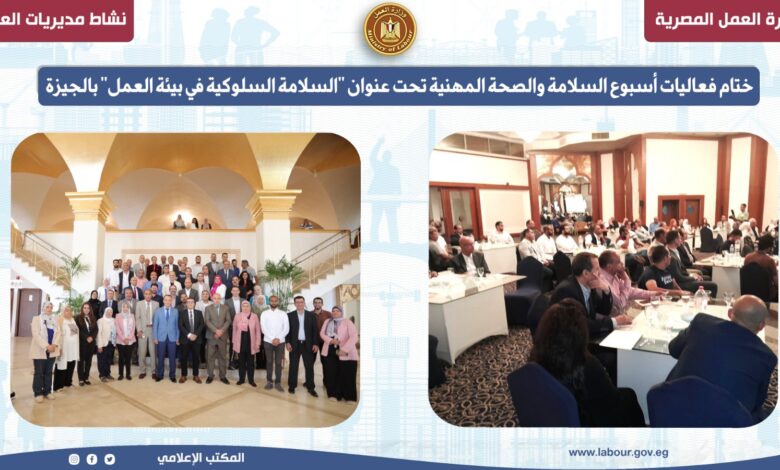 اختتمت مديرية العمل بمحافظة الجيزة فعاليات أسبوع السلامة والصحة المهنية تحت عنوان “السلامة السلوكية في بيئة العمل”، والذي أُقيم بفندق بيراميدز بارك ريزورت،