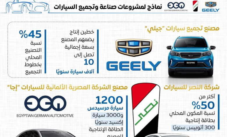 وتضمنت الإنفوجرافات، نماذج لعدد من مشروعات صناعة وتجميع السيارات، منها مصنع تجميع سيارات “جيلي”،