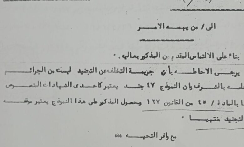 ذلك لان المستند الذي حصلت عليه اخبار الصباح يحمل رقم قيد 20/  27000 بتاريخ 2/4/1991 والمستند موقع عليه من لواء اركان حرب و مدير اداره التجنيد والتعبئه بما يعني  ان الشهاده الصادره من القوات المسلحه من اداره التجنيد هي اعفاء قانوني لا يجوز تفسيره على عكس محتواه .