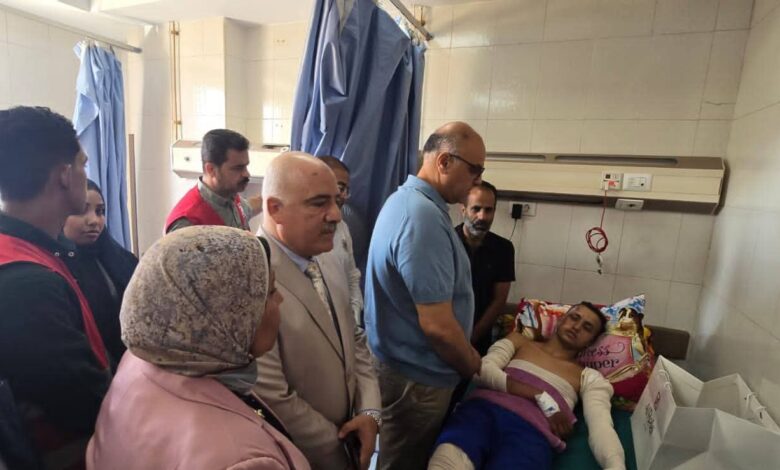 وخلال الزيارة، اطمأن المحافظ على الحالة الصحية للمصاب، ووجّه بتوفير كافة أوجه الرعاية الطبية اللازمة له،