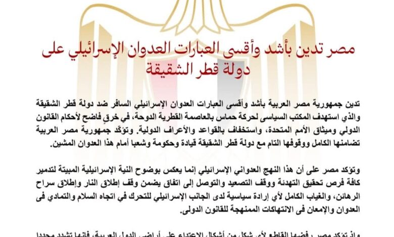 تدين جمهورية مصر العربية بأشد وأقسى العبارات العدوان الإسرائيلي السافر ضد دولة قطر الشقيقة والذي استهدف المكتب السياسى لحركة حماس بالعاصمة القطرية الدوحة،