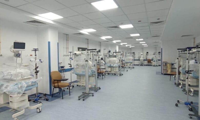 و22 سرير عناية مركزة، و27 حضانة، و36 ماكينة غسيل كلوي، و5 غرف عمليات، وكذلك متابعة الأعمال في مستشفى دار السلام المركزي بسعة 70 سريراً للإقامة.