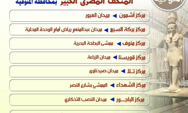 لنقل احتفالية افتتاح المتحف المصري الكبير يوم السبت المقبل 1 نوفمبر، وذلك في إطار حرص المحافظة على إتاحة الفرصة أمام المواطنين،