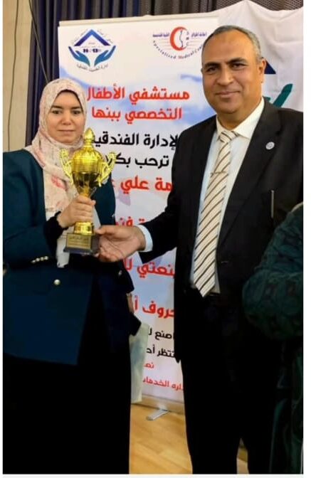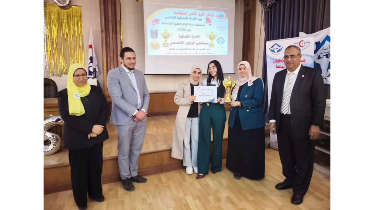 🔘و تم خلال الإحتفال تسليم الإدارات الفندقية الفائزة بكأس احتفالية يوم الإدارة الفندقية الخامس – يناير 2026 الإدارة الفندقية بمستشفي الزيتون التخصصي بقيادة/دكتور اسامة الامين مدير عام مستشفى الزيتون و الأستاذة / اميرة الحصرى مديرة الإدارة الفندقية و الفائزة بكأس المركز الأول احتفالية يوم الإدارة الفندقية الخامس – 2026