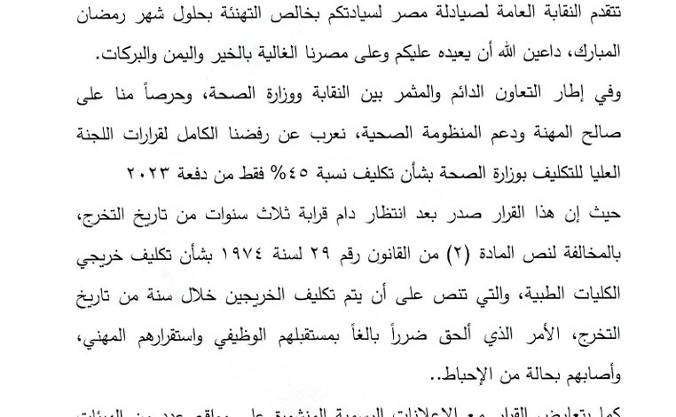 وأكدت النقابة فى خطابها على رفضها الكامل لقرارات اللجنة العليا للتكليف بوزارة الصحة بشأن تكليف نسبة 45% فقط من الصيادلة دفعة 2023،