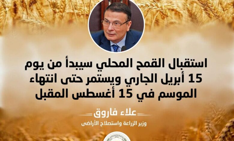 لافتاً إلى أن استقبال القمح المحلي سيبدأ من يوم 15 أبريل الجاري ويستمر حتى انتهاء الموسم في 15 أغسطس المقبل.