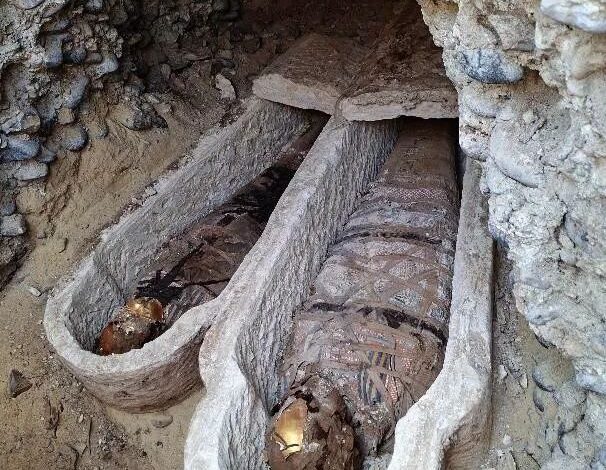 إلى جانب توابيت خشبية، وثلاثة ألسنة ذهبية وآخر من النحاس، فضلًا عن وجود دلائل على استخدام رقائق الذهب على بعض المومياوات.