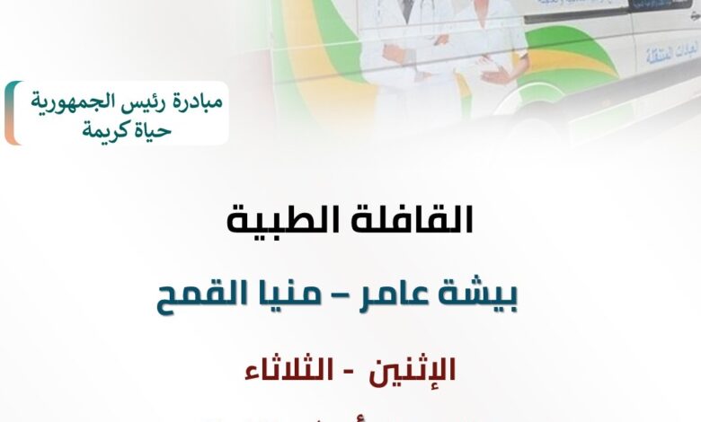 أعلنت مديرية الشؤون الصحية بمحافظة الشرقية أن يومي الإثنين و الثلاثاء ٢٧ و ٢٨ أبريل ٢٠٢٦ سيتم إطلاق قافلة طبية علاجية مجانية بقرية بيشة عامر التابعة لمركز ومدينة منيا القمح ،