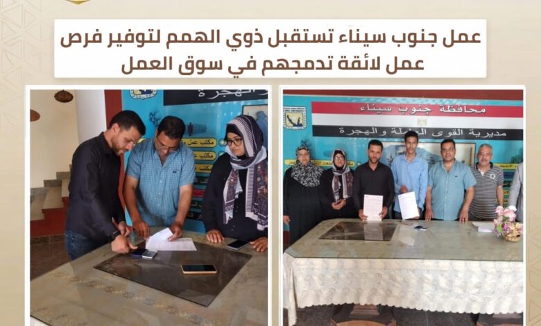 تنفيذًا لتوجيهات وزير العمل حسن رداد، استقبلت مديرية عمل جنوب سيناء، بإشراف أكرم محمد سيد أحمد، عدداً من ذوي الهمم لبحث توظيفهم بالقطاع الخاص.