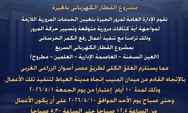 مما يستلزم الغلق الكلى لطريق مصر أسوان الزراعى الغربى بالإتجاه القادم من ميدان المنيب إتجاه مدينة العياط لتنفيذ تلك الأعمال..