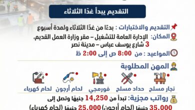 كتبت / سارة عبدالله تعلن وزارة العمل عن استمرار الاختبارات والتقديم في فرص العمل المتاحة بمشروع الضبعة النووية، اعتبارًا من…