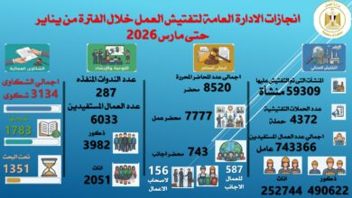 كتبت ساره عبدالله أعلنت وزارة العمل،اليوم، حصاد جهود الإدارة العامة لتفتيش العمل خلال الأشهر الثلاثة الماضية “من يناير إلى مارس…